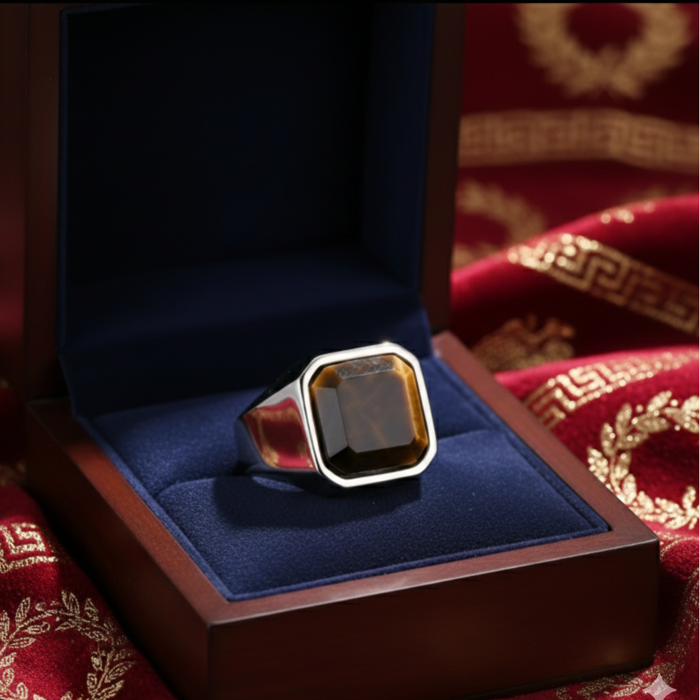 Inspirée par les minéraux sacrés utilisés par les protecteurs de la Rome Antique, la chevalière Aetites est une alliance entre la force brute de la nature et la précision de l'artisanat humain. Sa pierre aux reflets mordorés semble contenir l'énergie du soleil couchant sur les colonnes du Panthéon.
