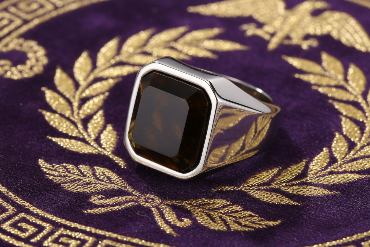Chevalière "Aetites" en Acier Poli – Pierre d'Œil de Tigre & Héritage Antique