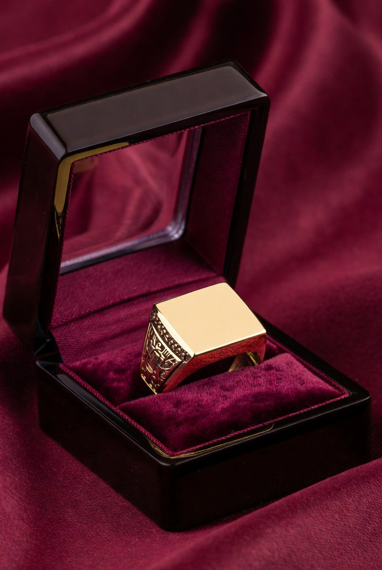 Symbole ultime d'autorité et de droiture, la chevalière Aureus Imperator est une réinterprétation moderne des anneaux portés par les plus grands conquérants. Son plateau carré massif, poli pour obtenir un éclat miroir, offre une surface d'une pureté absolue, tandis que ses flancs sont ornés de motifs héraldiques finement ciselés.