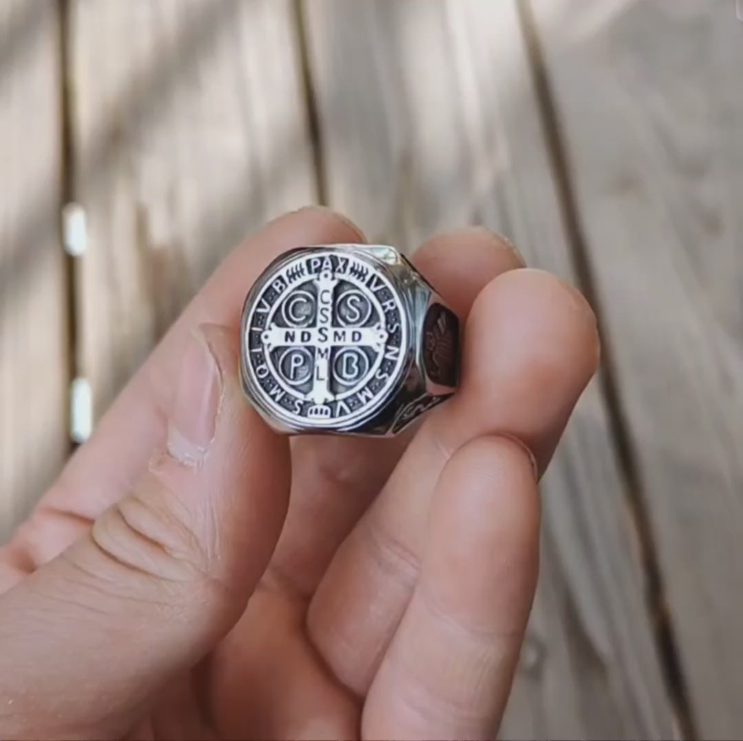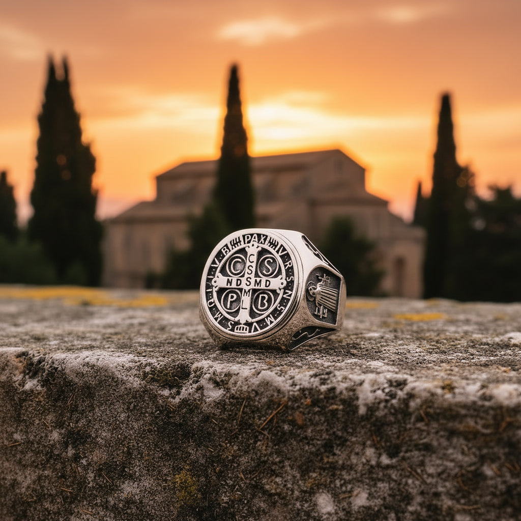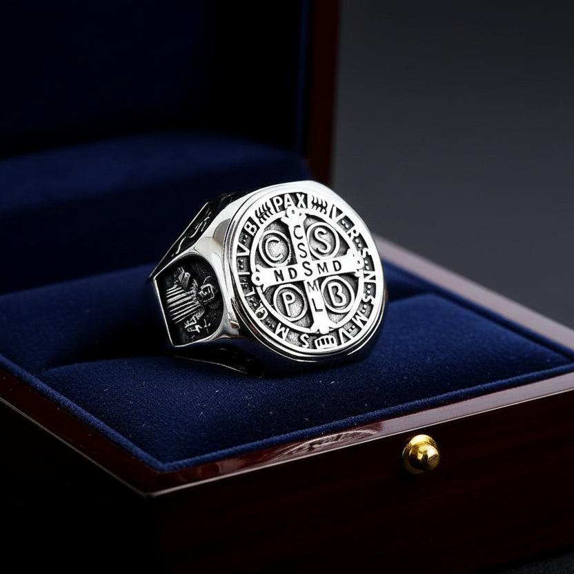 La chevalière Benedictio est une pièce d'une puissance symbolique rare. Elle arbore la Croix de Saint Benoît, l'un des symboles de protection les plus anciens et les plus respectés au monde. Gravée de formules latines sacrées (CSPB, CSSML, NDSMD), elle est conçue pour être un rempart spirituel et un rappel constant de la force intérieure qui habite celui qui la porte.