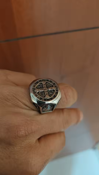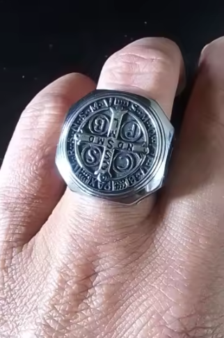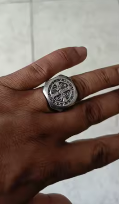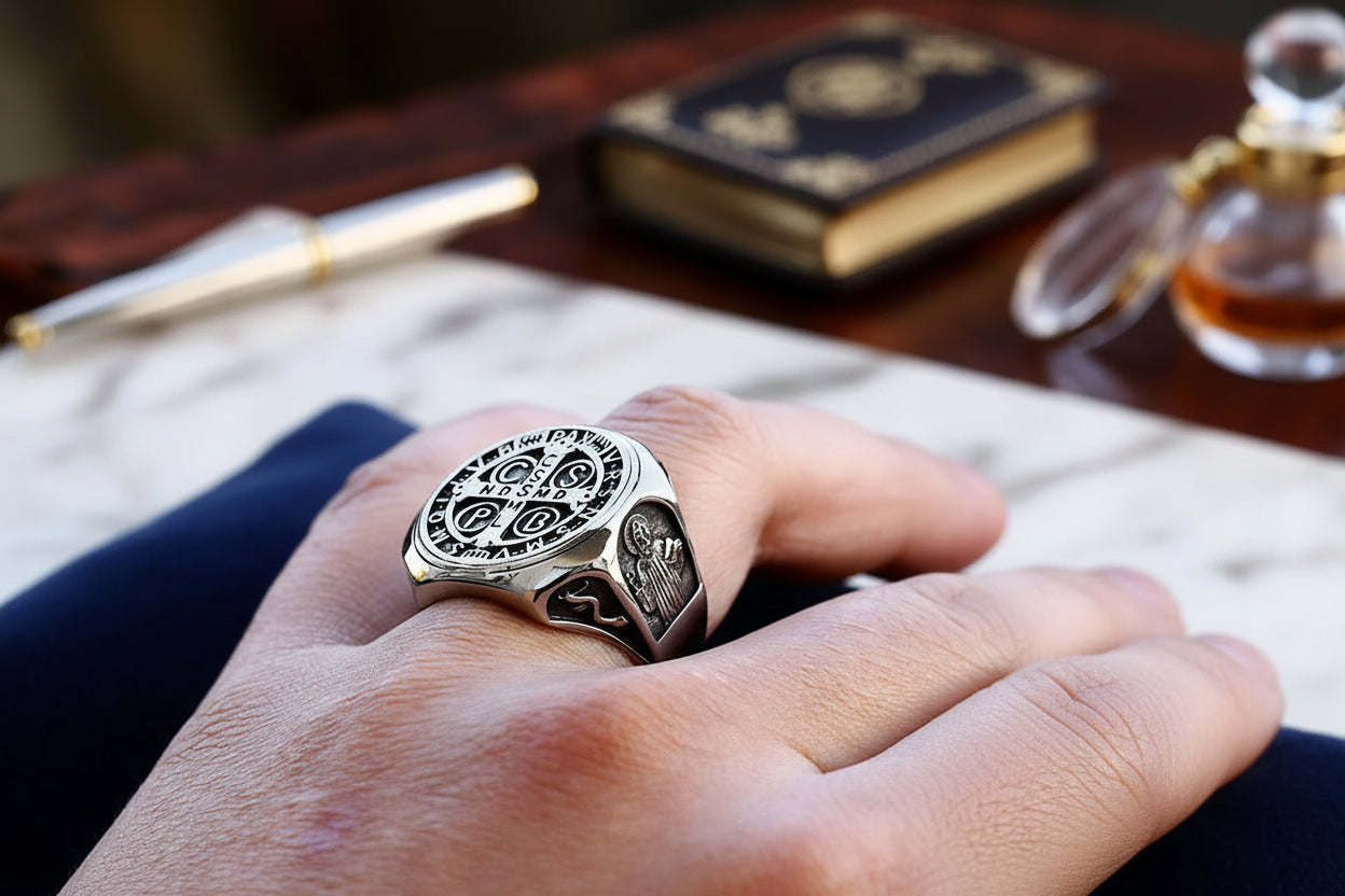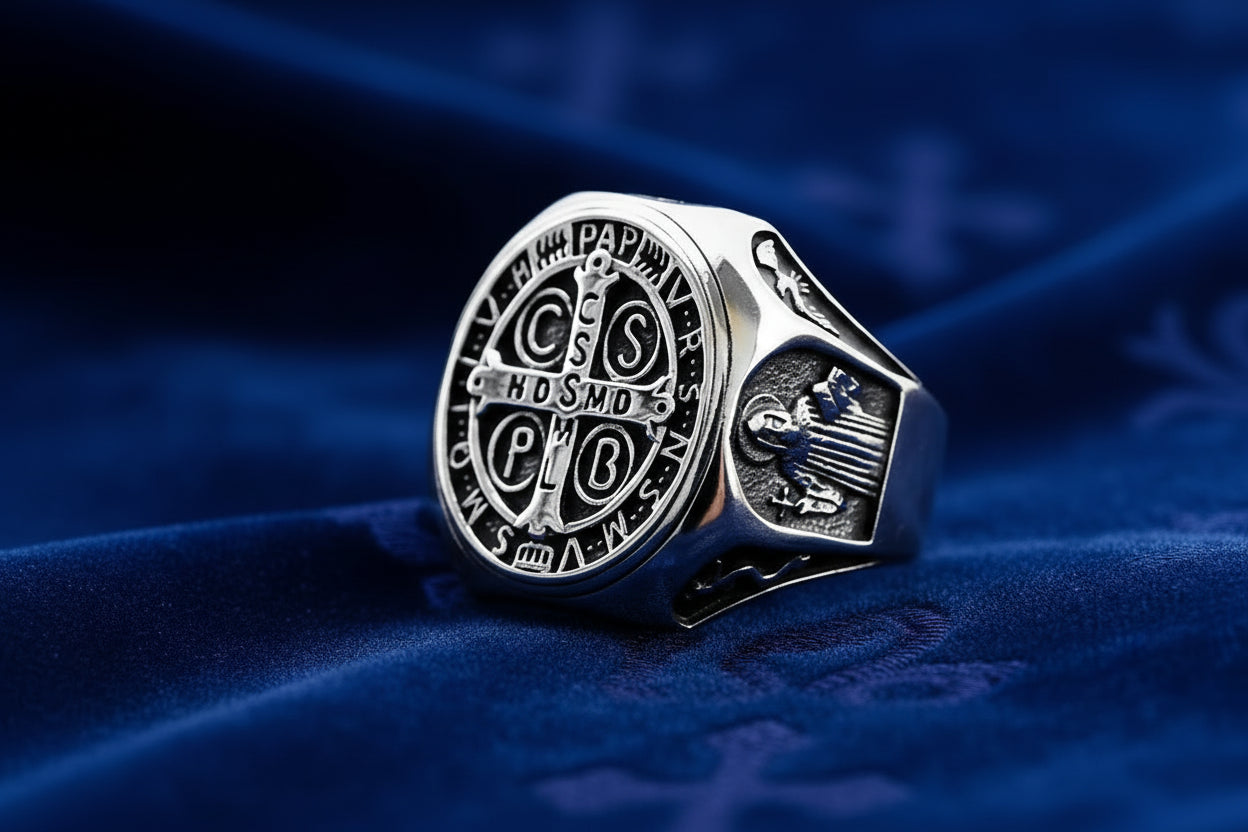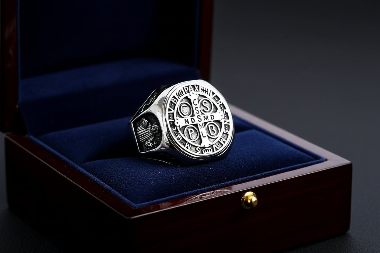 La chevalière Benedictio est une pièce d'une puissance symbolique rare. Elle arbore la Croix de Saint Benoît, l'un des symboles de protection les plus anciens et les plus respectés au monde. Gravée de formules latines sacrées (CSPB, CSSML, NDSMD), elle est conçue pour être un rempart spirituel et un rappel constant de la force intérieure qui habite celui qui la porte.