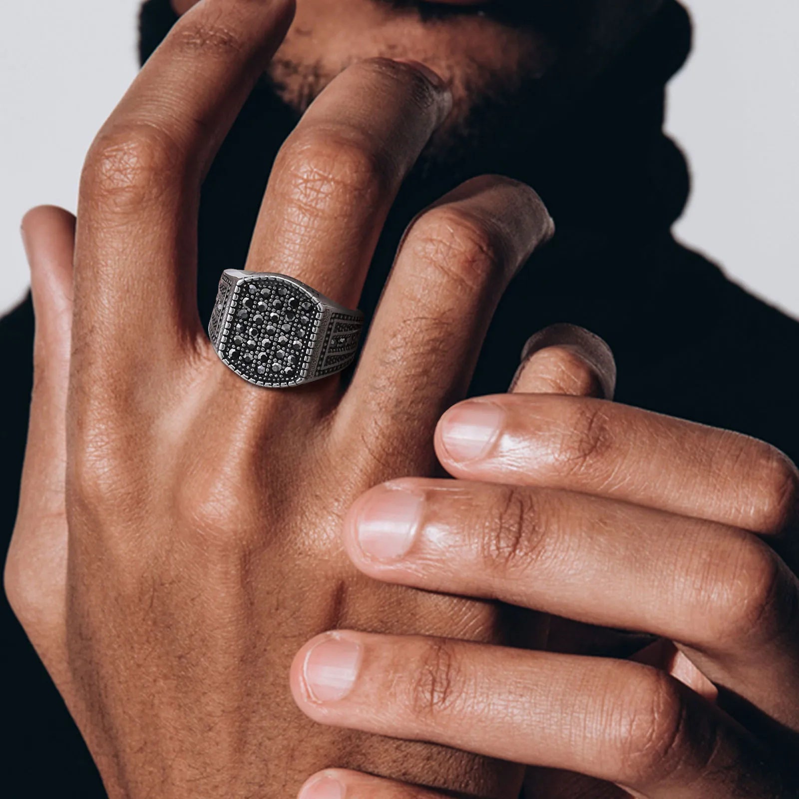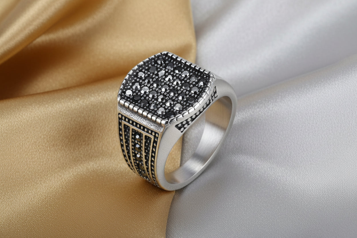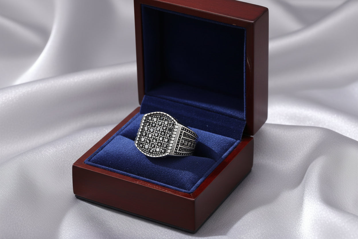 La chevalière Noctis exprime une présence silencieuse, fondée sur l’équilibre des formes et la profondeur des contrastes. Le plateau géométrique, serti de zircones cubiques noires, capte la lumière avec retenue, révélant une brillance maîtrisée plutôt qu’ostentatoire.